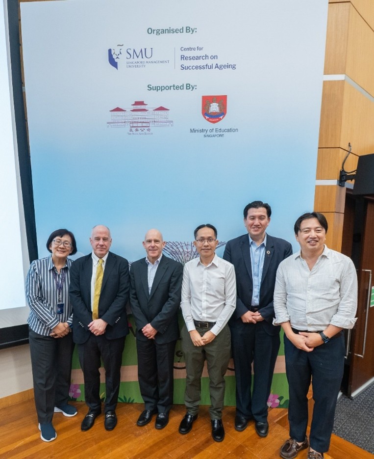 From Right to Left: Prof Paulin Straughan, Prof James Raymo, Prof Nicolas Cherbuin, Assoc Prof William Tov, SMU Vice-Provost Cheong Wei Yang, Assoc Prof Seonghoon Kim